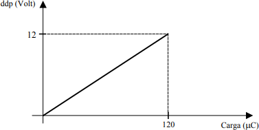 UNIMONTES 3° Etapa Socias 2020INSTRUÇÃO: Um capacitor, inicialmente descarregado, foi carregado até atingir uma carga de 120 µC. A variação da diferença de potencial (ddp) entre suas placas com a carga armazenada está representada no gráfico a seguir.
