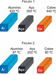UEA-Específico Exatas 2023Durante um processo de usinagem, três lingotes metálicos, um de alumínio, um de aço e um de cobre, são produzidos em diferentes temperaturas, indicadas na figura 1, e deixados sobre uma mesa para resfriar. Passado certo período, as temperaturas dos lingotes são aferidas e anotadas novamente, conforme a figura 2.