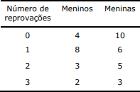 UEPG PSS 1 2022A tabela abaixo mostra o número de reprovações dos meninos e das meninas, numa turma do Colégio OBA, na disciplina de Física. Como exemplo, podemos afirmar, de acordo com a última linha da tabela, que dois meninos e três meninas dessa turma reprovaram três vezes na disciplina de Física.