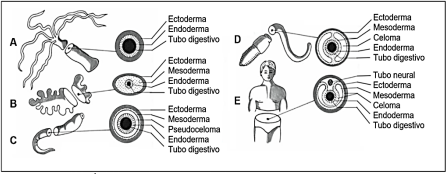 os animais B e C são protostômios e os animais D e E são deuterostômios, pois estes últimos possuem celoma.