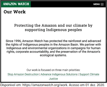 O texto apresenta a página principal de uma organização sem fins lucrativos sediada no Canadá denominada Amazon Watch.