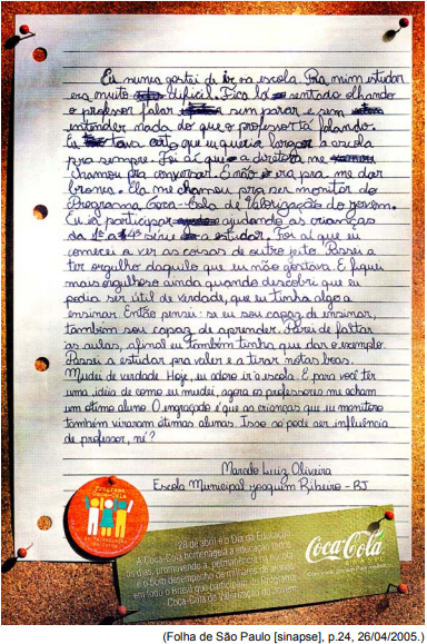 O texto abaixo é uma peça publicitária do Programa Coca-Cola de Valorização do Jovem. Leia-o para responder à questão.