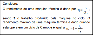 Um cientista afirma ter construído uma máquina térmica que trabalha entre as temperaturas T1 = 400 K e T2 = 600 K e que produz trabalho a uma taxa de 200 W. A quantidade de calor fornecida pela fonte quente à máquina a cada ciclo é Q2 = 100 J e sua freqüência de trabalho é 4 ciclos por segundo.