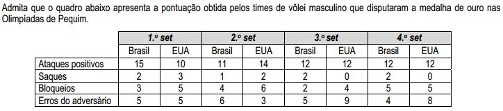 ( ) A média de aproveitamento no ataque da seleção americana nos três últimos sets foi superior a 60%.