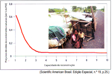 O gráfico abaixo apresenta os prejuízos econômicos em conseqüência de catástrofes naturais, em função da capacidade de reconstrução da economia afetada (representada por um índice).
