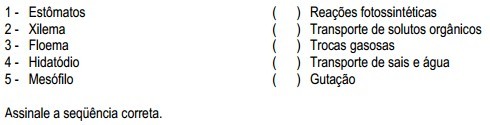 Os vegetais são constituídos por conjuntos de células que formam os vários tecidos que desempenham processos fisiológicos fundamentais ao seu desenvolvimento. A coluna da esquerda apresenta estruturas e a da direita, processos fisiológicos. Numere a coluna da direita de acordo com a da esquerda.