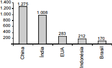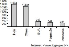 Países mais populosos em 2000 (em milhões de habitantes)