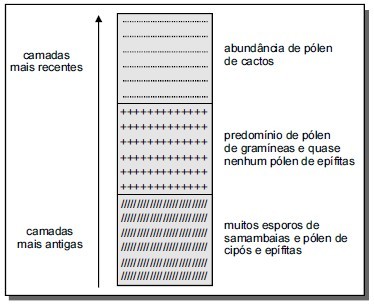 A análise de esporos de samambaias e de pólen fossilizados contidos em sedimentos pode fornecer pistas sobre as formações vegetais de outras épocas. No esquema a seguir, que ilustra a análise de uma amostra de camadas contínuas de sedimentos, as camadas mais antigas encontram-se mais distantes da superfície.