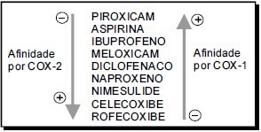 O esquema abaixo mostra alguns antiinflamatórios (nome genérico). As setas indicam a maior ou a menor afinidade dessas substâncias pelas duas enzimas