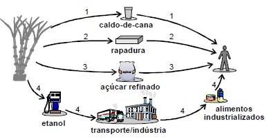 Há diversas maneiras de o ser humano obter energia para seu próprio metabolismo utilizando energia armazenada na cana-de-açúcar. O esquema abaixo apresenta quatro alternativas dessa utilização.