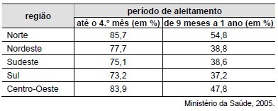 Ao ingerir leite materno, a criança adquire anticorpos importantes que a defendem de doenças típicas da primeira infância. Nesse sentido, a tabela mostra que, em 2005, percentualmente, as crianças brasileiras que estavam mais protegidas dessas doenças eram as da região