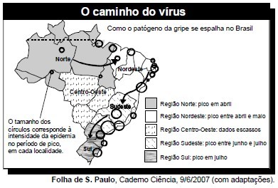 No mapa a seguir, descreve-se a disseminação do vírus da gripe no Brasil, em 2007.