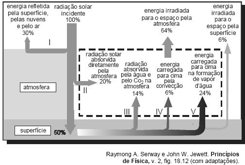 O diagrama abaixo representa, de forma esquemática e simplificada, a distribuição da energia proveniente do Sol sobre a atmosfera e a superfície terrestre. Na área delimitada pela linha tracejada, são destacados alguns processos envolvidos no fluxo de energia na atmosfera.