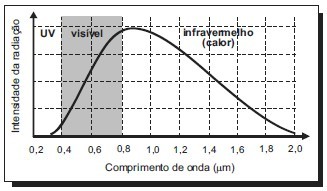 A passagem de uma quantidade adequada de corrente elétrica pelo filamento de uma lâmpada deixa-o incandescente, produzindo luz. O gráfico abaixo mostra como a intensidade da luz emitida pela lâmpada está distribuída no espectro eletromagnético, estendendo-se desde a região do ultravioleta (UV) até a região do infravermelho.